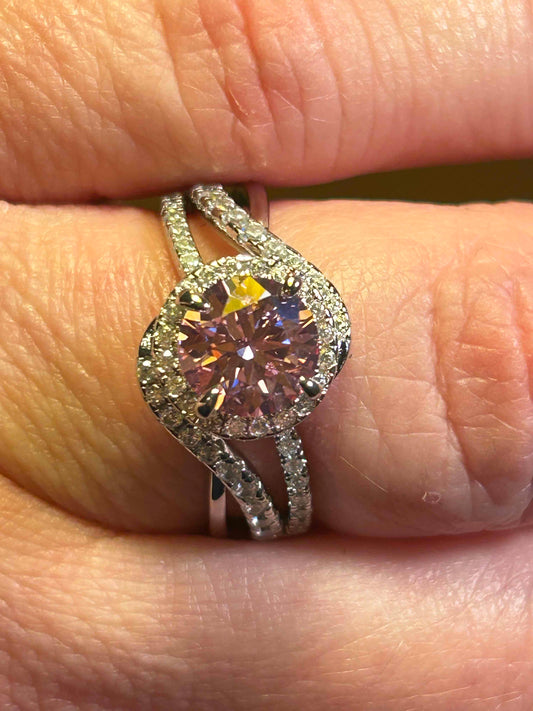 Its split-band design, fully encrusted with shimmering pavé stones, gives the illusion of two delicate bands, embracing the center stone in a setting that's both modern and regal. Crafted from 925 sterling silver, the Valeris is made to last—and to be noticed.